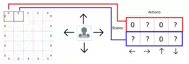 其中,图中的每个小方格表示智能体的状态,共有 5*5=20 种状态,对应的每个状态智能体可采取 4 个行动,为向上、向下、向左、向右移动,如果为 0 表示不可以移动。这样依据状态和行动,可生成表格 Q-Table,每个单元格中的分数表示对状态采取对应行动后产生最大期望奖励的度量值。表格中的 4 列,分别表示向左、向右、向上、向下移动;表格中的每行表示智能体的状态。对应于上节提到的老鼠吃奶酪的游戏,生成 Q-Table 后,选择对应状态的行,得分最高的行动。Q-Learning 算法的主要目的是能够学习得到 Q-function,如下所示: