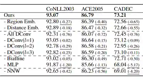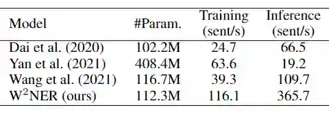 通过进一步的消融实验,我们探索了不同参数和部件对整体框架的影响。此外我们模型在相对较小的参数情况下,其训练和推理速度超过了多个非连续实体识别模型。