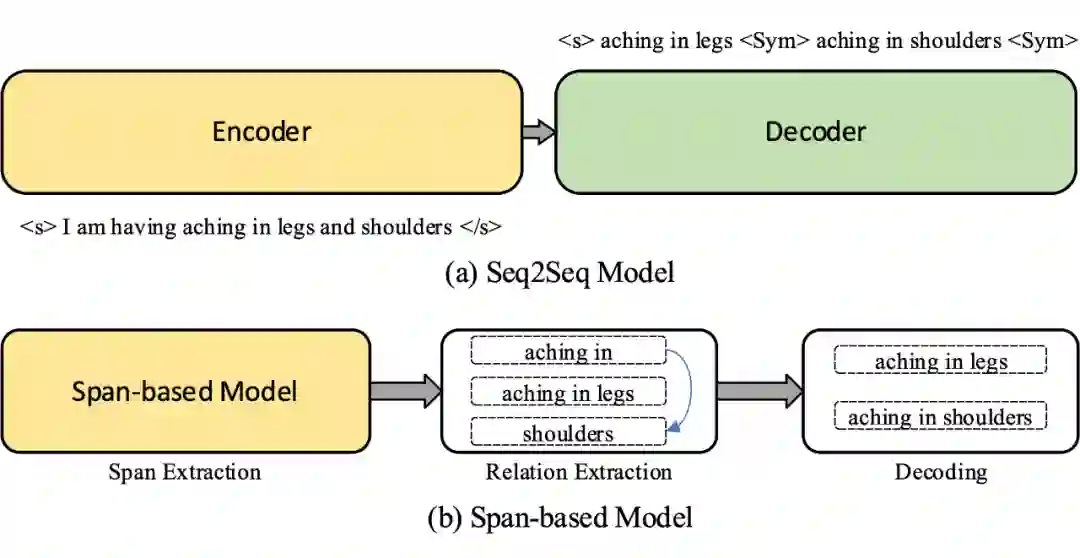 然而我们在针对三种实体类型的共性进行深入挖掘后,认为词语之间在语义上的连接特征才是 UNER 最为关键的问题。例如图 1(a)中,识别扁平实体“aching in legs”相对而言是较为简单,因为这个实体所包含的词是天然相邻的。而要识别出非连续实体“aching in shoulders”,则一个成功的 UNER 模型需要准确高效地片为片段“aching in”和片段“shoulders”之间在语义上的邻接关系进行建模。