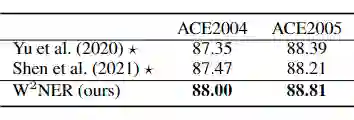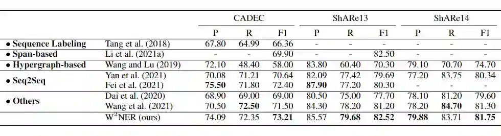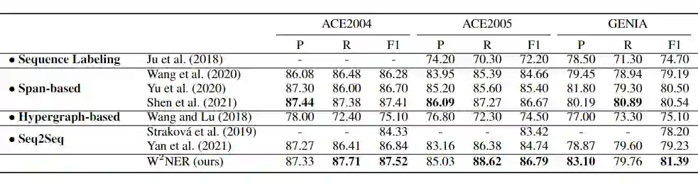 表 1-5 分别展示了上述任务和数据集上与基线模型对比的结果。实验结果表明,我们提出的基于词对关系抽取的方法,通过对邻接关系和头尾关系的识别,可以同时解决扁平实体、重叠实体和非连续实体的三种子任务,并在 14 个数据集上的效果都优于之前的工作。
