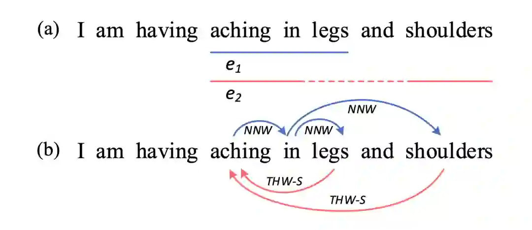 如图 1(b)所示。其中 NNW 表示两个词在某个实体中相邻(如“aching”->“in”),而 THW-* 则表示两个词是某个实体的头部和尾部,且该实体类型为“*”(如“leg”->“aching”,Symptom)。具体的词对关系分类示例如图 3 所示。