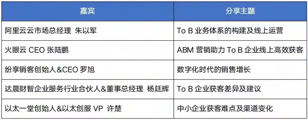 除了今天的B端增长大会,我们还在3月4日和3月5日的19:30-20:30,为大家安排了阿里云和火眼云的增长获客专场,力争这一周里为大家尽量讲全、讲透To B获客的内容。