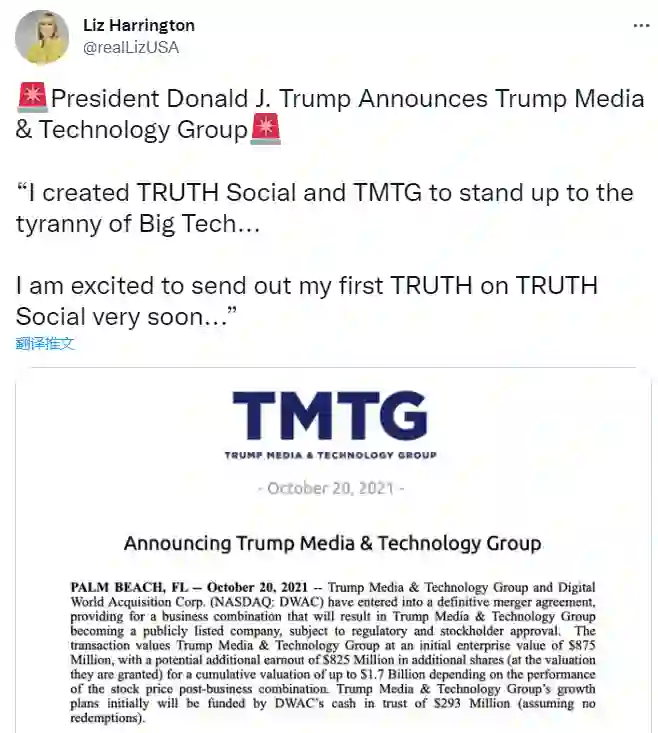 据报道,「真实社交」平台将通过由特朗普媒体和技术集团和一家SPAC公司「DWAC」合并而成的新公司创建。特朗普媒体与科技集团(TMTG)表示,目前与DWAC「已达成最终合并协议,进行业务合并」。