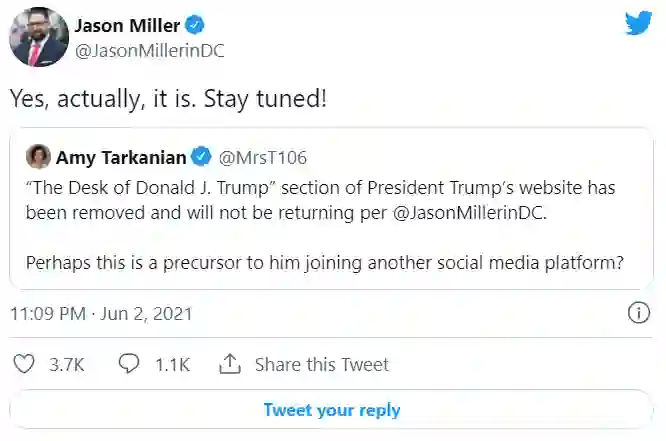 不过,在被问到此举是否是特朗普加入「另一个社交媒体平台」的「前兆」时,米勒发推特给出了毫不含糊的肯定回答:「是的,敬请关注!」