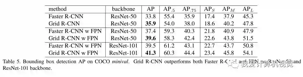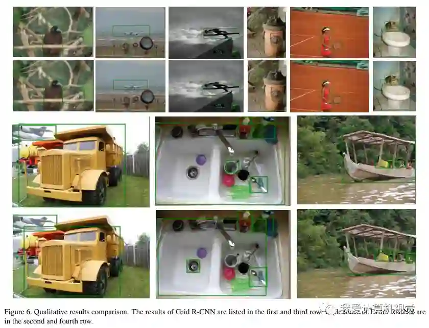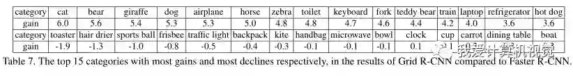 作者最后列出了Grid R-CNN对各目标类别的精度增益,发现那些矩形和长方形目标(例如键盘,笔记本电脑,叉子,火车和冰箱)往往获得更大的精度增益,而具有圆形性质的物体(例如运动球,飞盘,碗,钟和杯子)则性能下降或获得较小的增益。