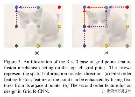 作者将距离特定网格点最近的相邻网格点(1个单位网格长度)组成的网格点集合的特征融合称为一阶特征融合,次近的相邻网格点(2个单位网格长度)组成的网格点集合的特征融合称为二阶特征融合。下图中(a)(b)分别展示了此融合过程。