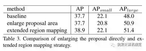 可见,直接扩大候选框区域的方法伤害了精度,而本文提出的扩展区域映射(extended region mapping)的方法则使精度有较大的提高(1.2个AP)。