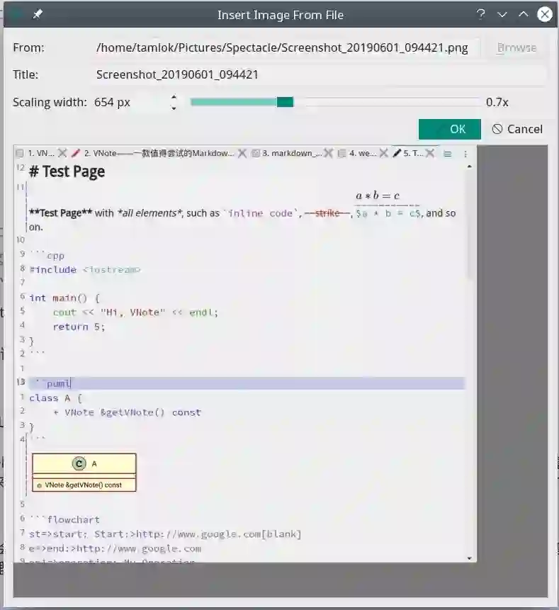 VNote 支持直接粘贴插入图片,包括下载并插入网络图片。VNote 会将图片保存到与笔记文件同文件夹下面的一个文件夹,所以用其他编辑器打开 VNote 的笔记,一般都是可以正常显示图片的。另外,VNote 还会管理插入的图片,将不再需要的图片自动清理。