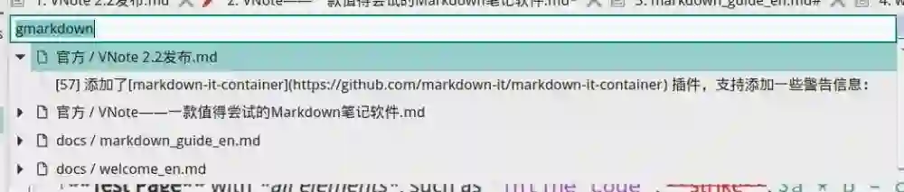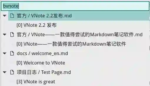 VNote 借鉴了代码编辑器里面的模糊搜索功能,提供了“通用入口”功能。通过一个简单的快捷键即可唤出一个输入框,输入内容,即可实现全文搜索、大纲搜索等功能。