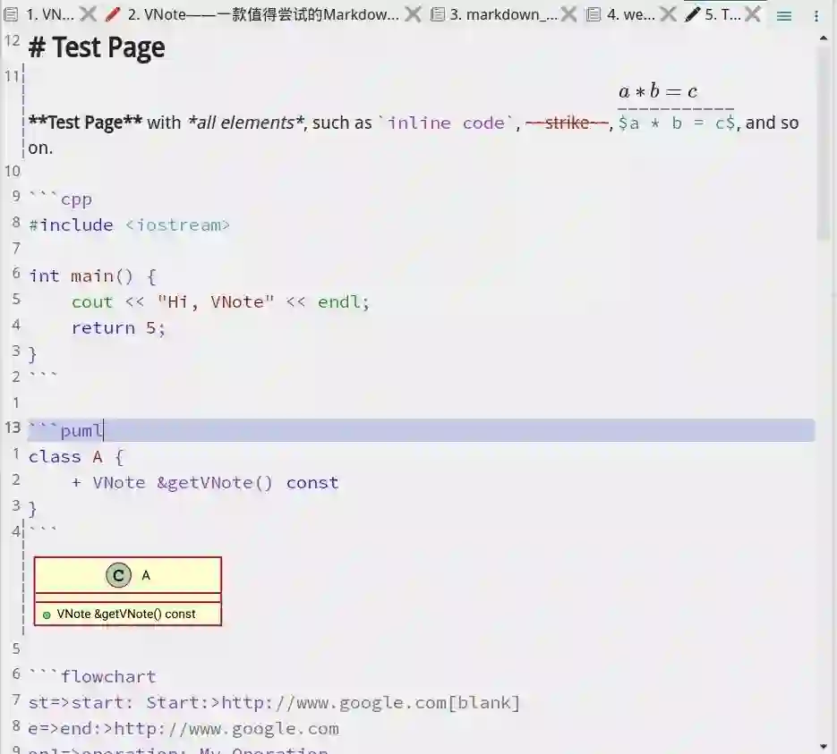 VNote 区分编辑和阅读模式,这是 VNote 编辑模式的一个界面。该界面展示了 VNote 支持的主要 Markdown 元素: