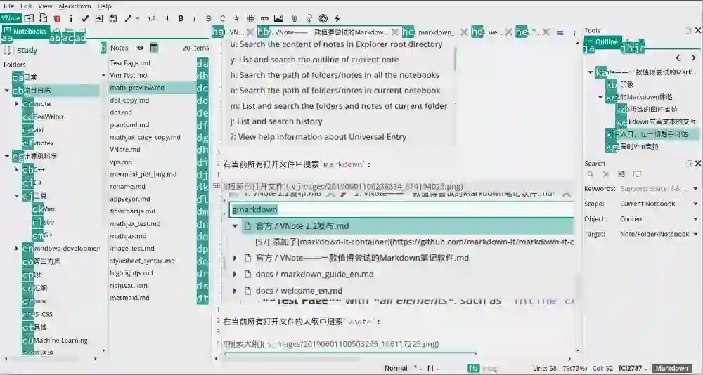 在 VNote 中,我基本很少使用工具栏那个传统的全文搜索了。要打开一个文件?通用入口!要查找一个关键字?通用入口!搜索所有大纲?通用入口!列出指定标签的文件?通用入口!全程快捷键高速操作,C++ 实现的全文搜索引擎即刻为你呈现所有结果!