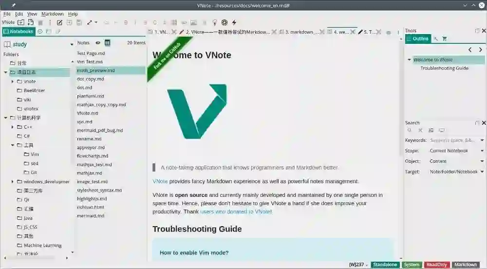 VNote 是一款跨平台的开源 Markdown 笔记软件(项目地址 )。不像其他多数宣称跨平台的软件,VNote 将 Linux 和 Windows 都作为主要支持平台,在 Linux 上提供非常优秀的体验。VNote 的目标是做一个带有舒适 Markdown 编辑体验的笔记软件,或者带有强大文件管理功能的 Markdown 编辑器。VNote 借鉴了程序员日常使用的代码编辑器的很多优点,特别是 Vim 的很多优秀思想,尽力成为一款更懂程序员和 Markdown 的笔记软件。