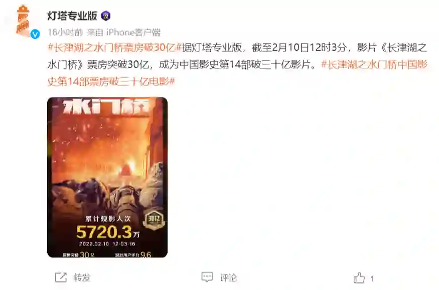据灯塔专业版,截至2月10日12时3分,影片《长津湖之水门桥》票房突破30亿,成为中国影史第14部破30亿影片。(海外网)