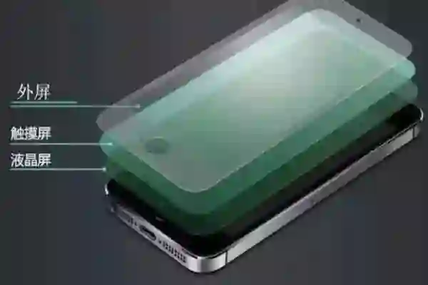 最外层的是外屏,表面很光滑,特点是有极高的硬度和抗划伤能力,制作过程较为复杂,需要经过抛光、硬化、超声波清洗等流程才能完成,主要用来保护手机内部结构。
