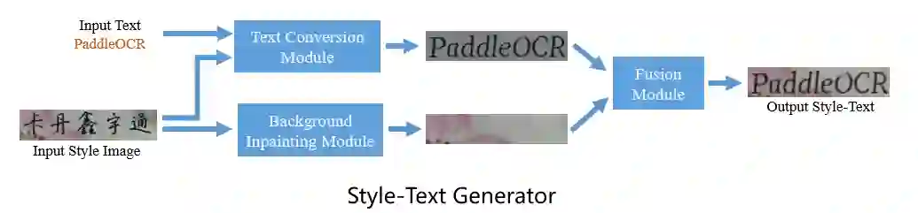 不同于常用的基于 GAN 的数据合成工具,Style-Text 主要框架包括 ①文本前景风格迁移模块 ②背景抽取模块 ③融合模块。经过这样三步,就可以迅速实现图片文字风格迁移啦。