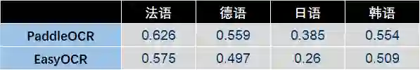 多语言识别模型效果升级:中文、英文、韩语、法语、德语、日文识别效果均优于 EasyOCR。