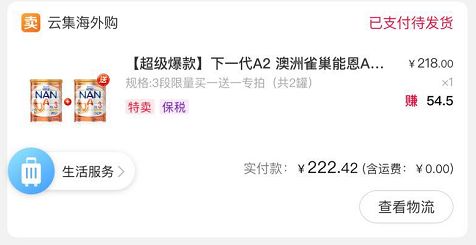 她展示的一张订单截图线上,一件雀巢能恩奶粉售价218元,自己可以赚到54.5,也就是25%的收益。而目前,这款奶粉在活动结束后,售价涨到了238元,店主分享的收益则降到了23.8。