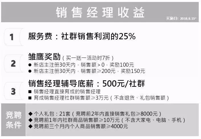 创业邦拿到的一份资料显示,销售经理能拿到的服务费为社群销售利润的25%,竞聘条件为两年内直接邀请21人,一年内社群销售额超过10万且不含高单价商品,三个月内个人直接销售额超过4000元。服务经理的竞聘条件则是三年内个人直接邀请31人,直接邀请加间接邀请总和超过905人。
