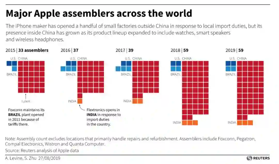 路透社 2019 年 8 月经过调查后发布的报告显示,苹果在印度和巴西两国生产的产品只是用来满足当地需求,而在中国增加的苹果代工厂远超过中国以外。
