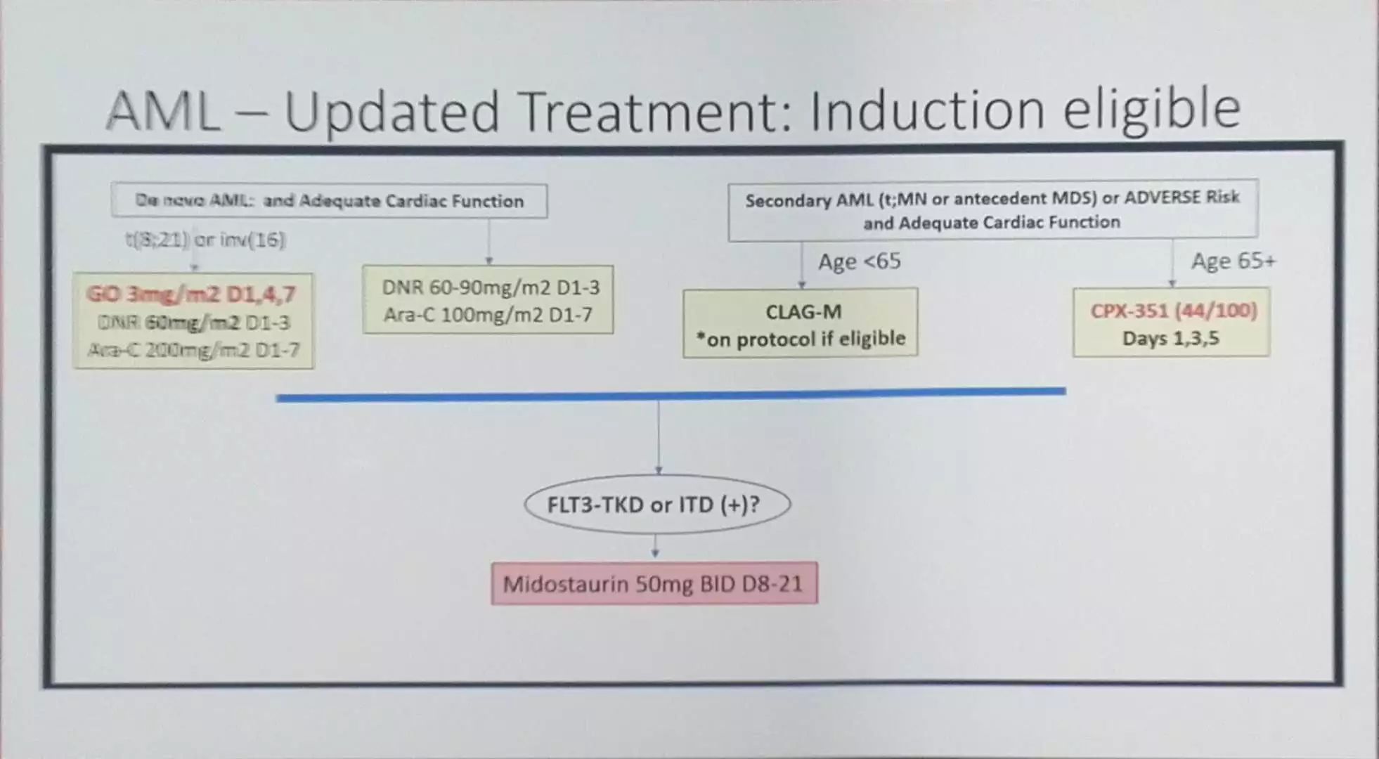 在2015年ASH会议上,一项国际多中心临床试验显示:米哚妥林(PKC412)与化疗联合治疗FLT-3突变的急性髓系白血病,可提高此类患者的总体生存时间(OS),这个临床研究的最终结果发表在今年的新英格兰杂志。基于这个研究,今年FDA批准:米哚妥林(PKC412)用于FLT-3突变的急性髓系白血病患者的治疗。在本届ASH会,FDA对米哚妥林的临床应用做了进一步的说明,基于目前的临床研究结果,米哚妥林与化疗联合提高了急性髓系白血病的疗效,而后续的维持治疗并没有提高急性髓系白血病的临床疗效,相关的结果本届ASH也有报道。因此FDA认为,米哚妥林的应用应与化疗联合,维持治疗并不在获批的适应症。此外,未来的FLT-3抑制还有奎扎替尼(AC220)、Gilteritinib (ASP2215)以及Crenolanib等。这3种药物均为针对FLT-3的特异性抑制剂,能更好地抑制FLT3激酶的活性,其与化疗药物的联合应用可能大幅提高对FLT-3突变患者的疗效。今年ASH会议一项口头报告显示:将Crenolanib与DA方案联合治疗FLT-3突变的髓系白血病患者,其2年的总生存率达79%。