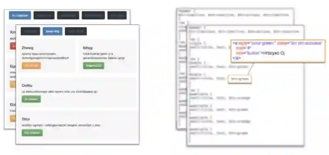 每个示例的源代码由一个领域特定语言 (DSL) 的标记组成,这是论文的作者为该任务创建的。每个令牌对应于 HTML 和 CSS 的一个片段,而编译器则被用来将 DSL 转换为 HTML 代码。