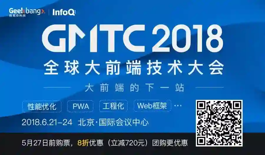 PWA、Web 框架、UI 与动画、Node... 大前端的下一站在哪里?前端工程师的价值和成长路径是什么?GMTC2018 上,来自 Google、Facebook、BAT 等 60+ 国内外一线前端大牛,将与你面对面探讨大前端领域最新技术趋势和实践,想要升职加薪就快来吧!扫描下方二维码或点击“阅读原文”了解更多大会详情!