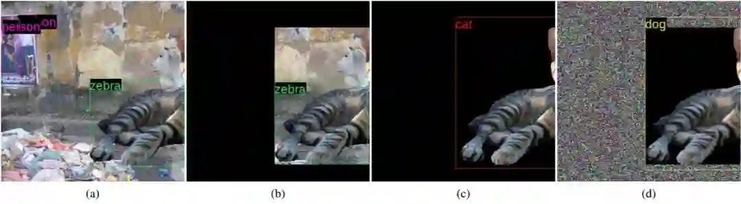 图 3:特征干扰。(a):一只部分可见的猫被检测为斑马;(b):丢弃检测边界框外的所有像素并不能固定对象的分类,这表明 ROI 内的特征可能会导致混淆;(c):丢弃 ROI 内的所有非「猫」像素也会导致固定的分类;(d):在边界框之外的范围内添加随机噪声再次导致错误的检测结果,显示了 ROI 外特征的影响。