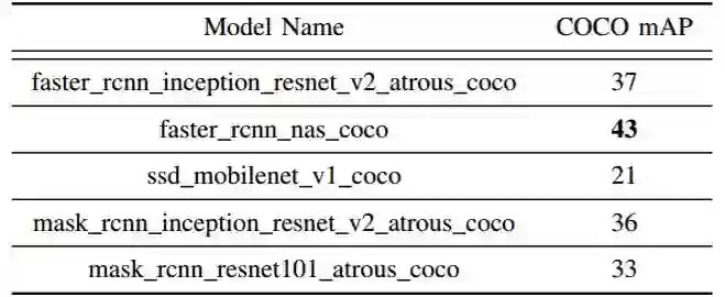 实验中采用的图像均来自 MS-COCO 数据集 2017 版的验证集。除非另有说明,我们采用的所有模型均来自 Tensorflow 目标检测 API [5]。因此,我们的实验易于复现,并且可以访问一组不同的当前最优目标检测架构。此外,如无特殊情况,我们仅使用在 MS-COCO 上训练的模型。这些模型可以从相应的 API 网页下载,还可以利用官方提供的代码将模型应用于图像。表 2 列出了我们使用的模型。