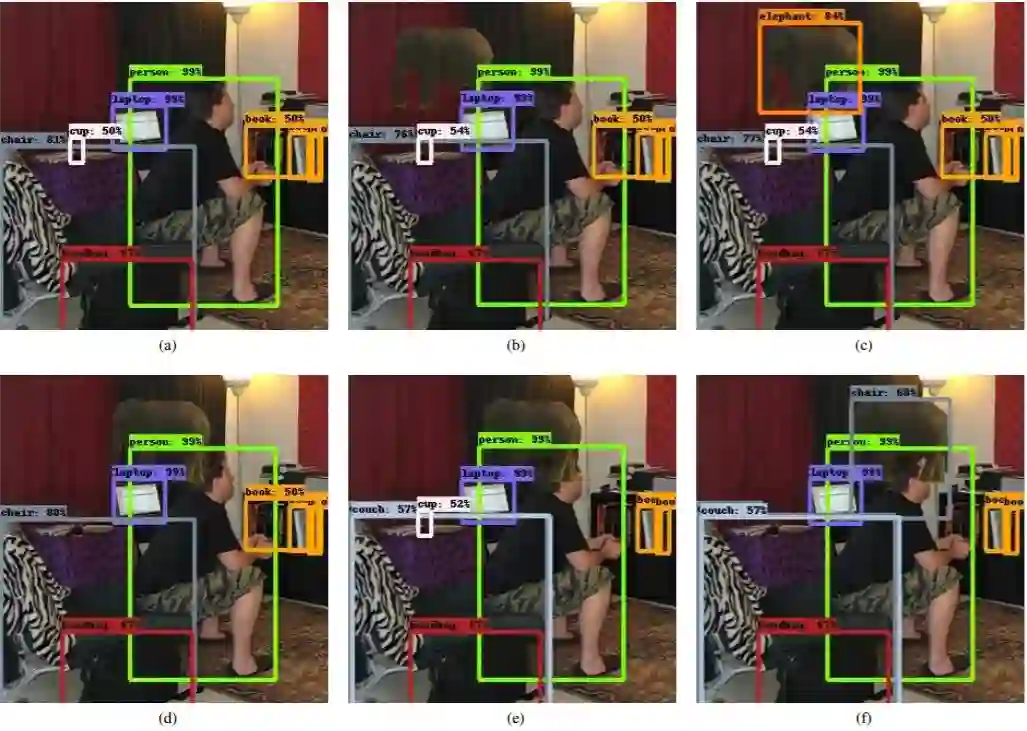 以下将展示特征干扰对检测过程的不利影响,这可能是对检测误差的合理解释。例如,考虑图 3(a)中的检测结果。一只部分可见的猫被检测到并归类为斑马。我们证实,从不属于实际目标(cat)的像素中获得的特征对指定的类有影响。这点同样适用于目标感兴趣区域(ROI)以内及以外的像素:在图 3(b)中,我们将边界框外的所有像素都设置为零。检测结果不变。当我们把边界框内的像素也归零,留下属于猫的像素时,得到的标签也会变成「猫」。这显示了 ROI 内像素的影响。然而,当我们将 ROI 之外的背景强度随机化时,标签会变成「狗」。这表明 ROI 之外的特征会影响检测的最终结果。此次实验是用 Yolov3[8] 方法的 PyTorch 端口执行的,速度非常快,产生的结果与目标检测的最新水平相当。这种情况下的最终分类需要依赖来自卷积层单个网格单元的特征。