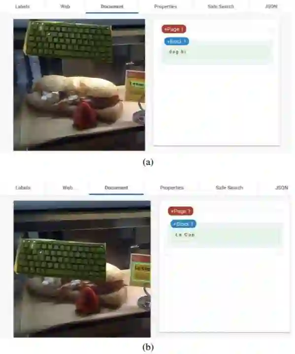 图 4:谷歌 OCR 上目标移植的非局部影响。放置在图像中两个不同位置的键盘会导致对右侧标志中文本的不同解释。顶部图像的输出是「dog bi」,底部是「La Cop」。