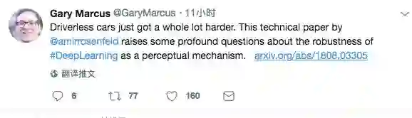 Gary Marcus 在其推特上评论道:这个针对机器学习系统鲁棒性的技术问题给自驾汽车的实现提出了相当大的挑战。