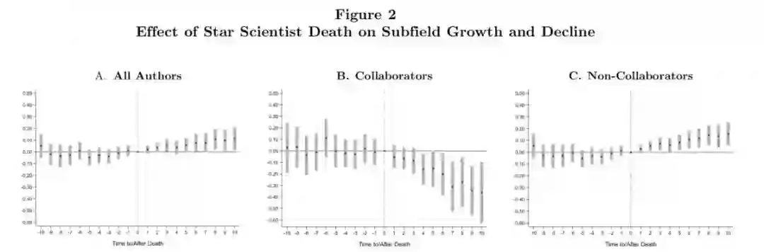 研究发现,科研明星们去世后,在他们所属的学科分区(subfield)里,从未与他们合作过的科学家们的文章发表数量提升了 8.6%。所有的影响都与控制组分区相对比,即那些科研明星们仍然在世的分区。