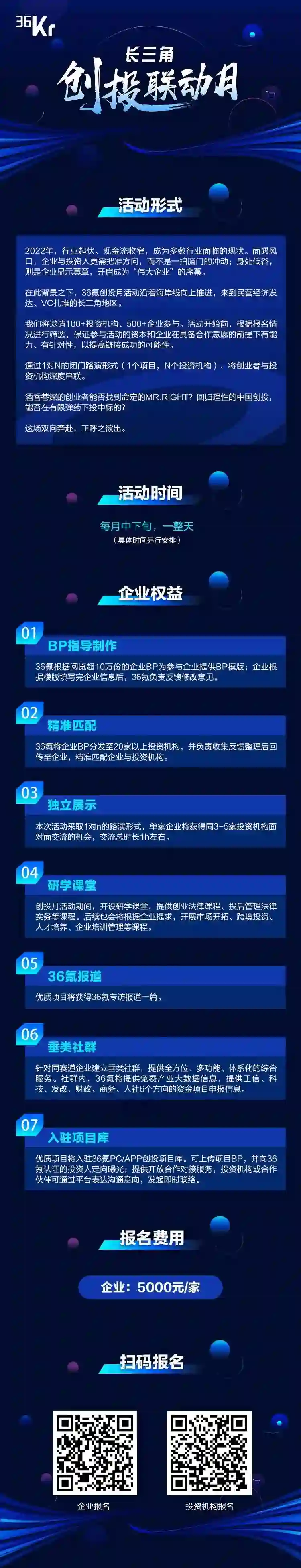 本次长三角创投月将从8月开始,一直持续到今年年底。每月中下旬开启路演活动,具体举办时间、地点另行通知。企业报名费用为每家5000元。