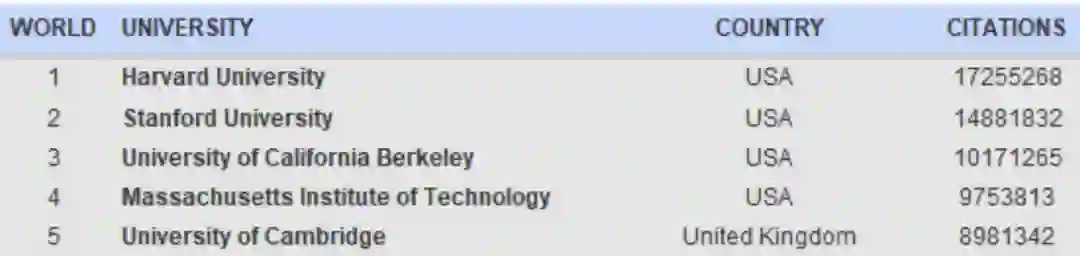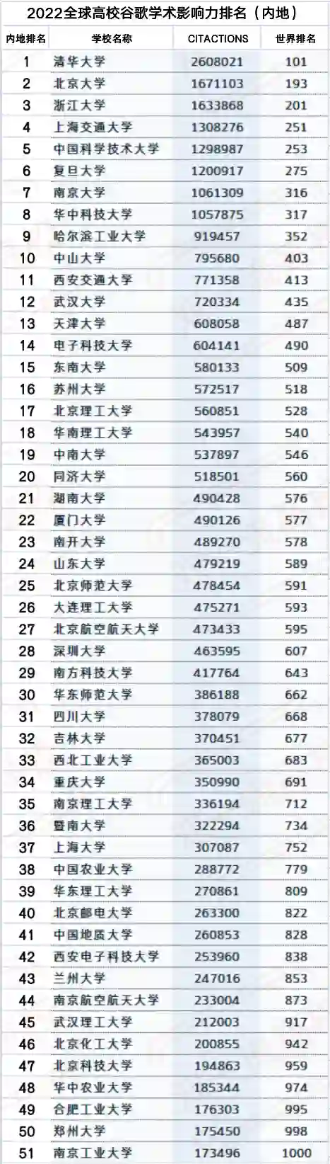 2022年2月4日,2022全球大学谷歌学术影响力排名最新出炉。根据该排名2022 年 1 月的 13.0.2版,哈佛大学、斯坦福大学、加州大学伯克利分校、麻省理工学院和剑桥大学位居世界前5名。中国内地排名最高的是清华大学,位居世界第101名。