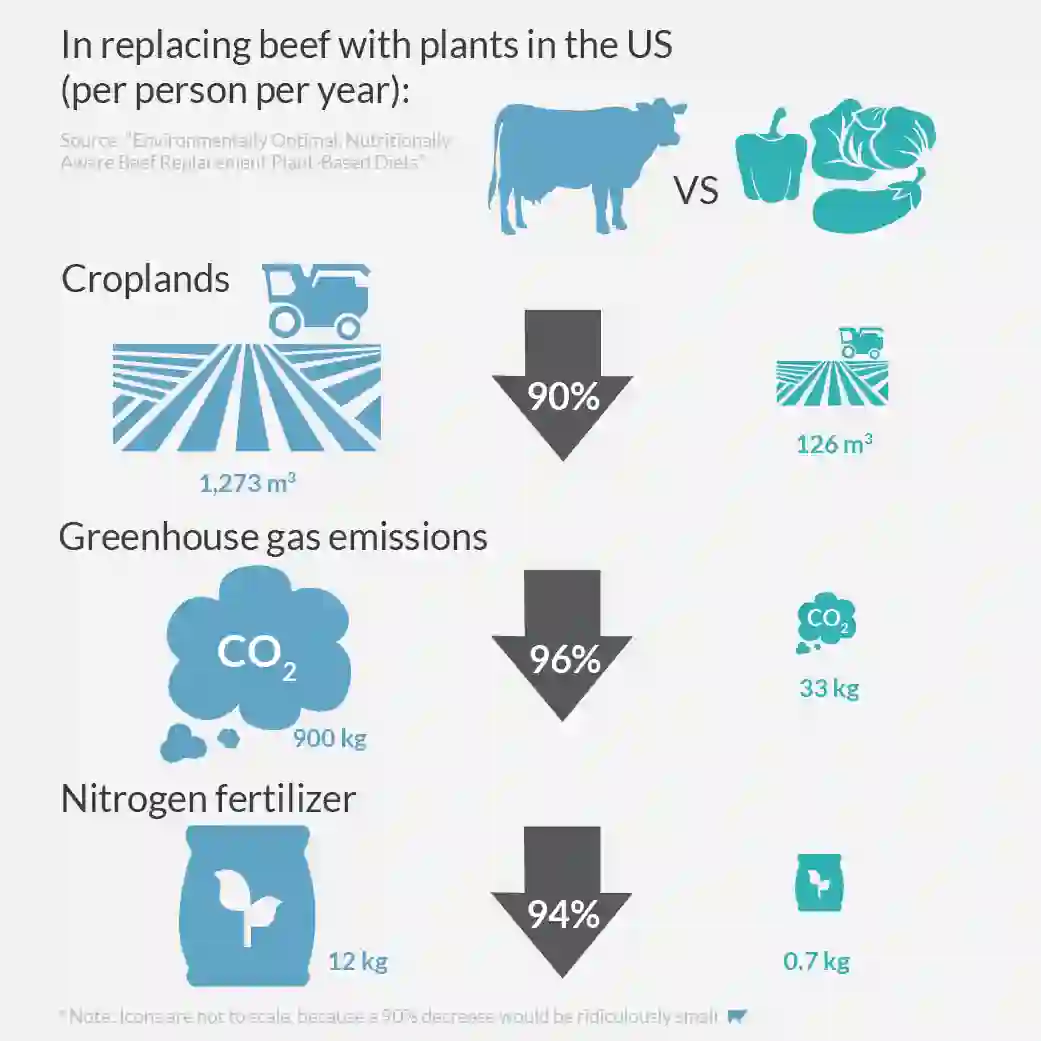 巴德学院科研人员发布的一项研究报告显示,将 1 位美国人 1 年消耗的牛肉替换成蔬菜后,占用耕地面积、温室气体排放、氮肥需求等均会降低 90% 以上