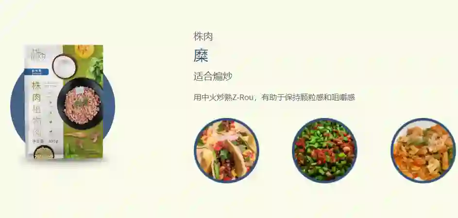 以国内的植物肉厂商星期零和 Z-Rou Meat (株肉)为例,都推出了肉丸、肉松、肉酱不同形态和风味的产品,适用于中西餐厅和家庭烹饪场景。