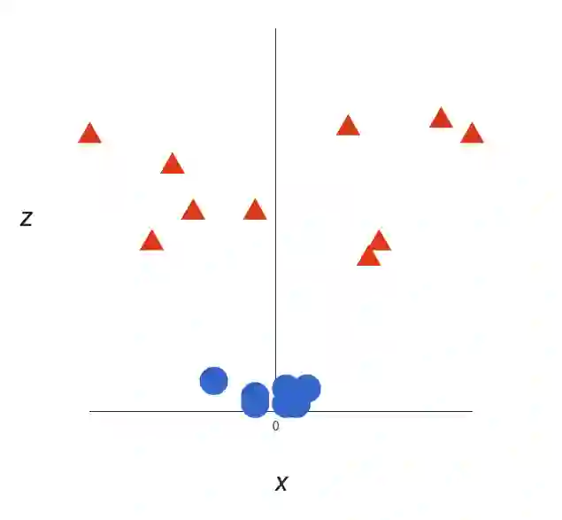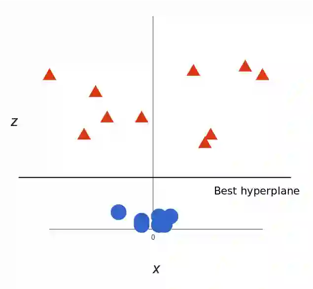 很明显,你无法找出一个线性决策边界(一条直线分开两个类别)。然而,两种向量的位置分得很开,看起来应该可以轻易地分开它们。