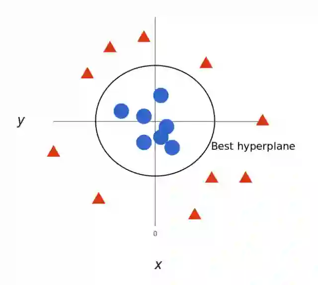 于是,我们的决策边界就成了半径为 1 的圆形,通过 SVM 我们将其成功分成了两个类别。