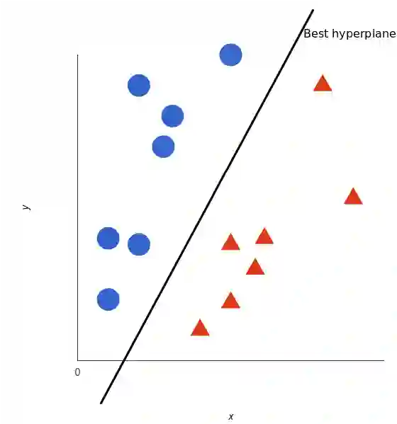 支持向量机会接受这些数据点,并输出一个超平面(在二维的图中,就是一条线)以将两类分割开来。这条线就是判定边界:将红色和蓝色分割开。