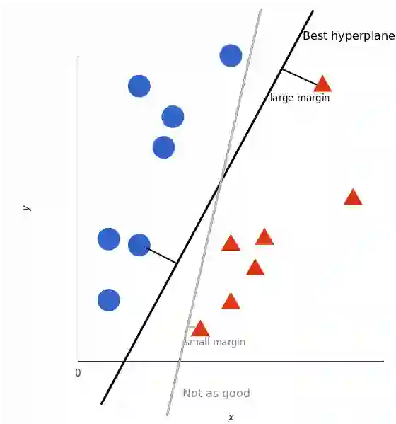但是,最好的超平面是什么样的?对于 SVM 来说,它是最大化两个类别边距的那种方式,换句话说:超平面(在本例中是一条线)对每个类别最近的元素距离最远。