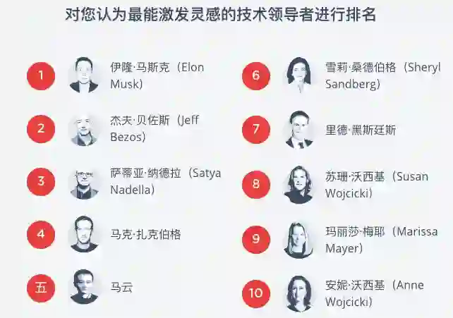 亚马逊创始人杰夫·贝佐斯(Jeff Bezos)、微软CEO萨蒂亚·纳德拉(Satya Nadella)、Facebook创始人马克·扎克伯格(Mark Zuckerberg)和阿里巴巴创始人马云位列前五。