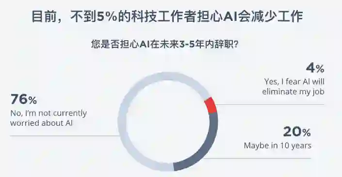 目前,仅4%的科技工作者担心AI在3-5年内会让自己失业,20%的科技工作者认为“或许10年之后”,76%的科技工作者现在并不担心。