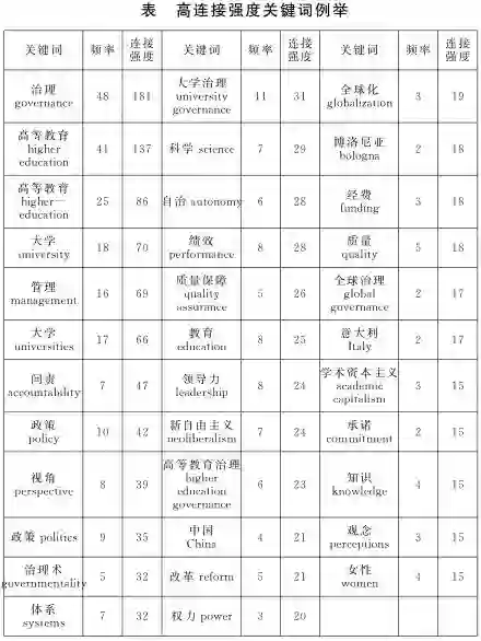关键词共现图谱参数设置:分析方式为关键词共现(Co-occurrence),分析单元为关键词(Allkeywords),最小共现值为2,文献包含关键词724个,共现关键词117个,下表概述了连接度较高(选取标准为15)的关键词,这些关键词在一定程度上代表了国外大学治理研究的核心话题(此文关键词共现的密度图谱略)。