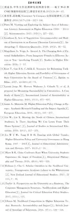 本研究选取WOS数据库核心合集(Web of Science TM Core Collection)中主题为大学治理(university governance),时间为2016~2018年的文献,将其研究领域聚焦于教育研究(educational research),文献类型锁定论文(article),截至2018年4月5日。共获得初始文献数据156篇。