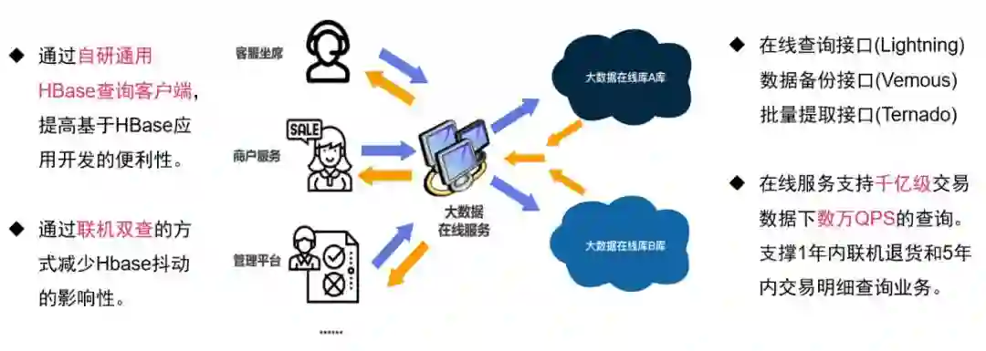 在服务层,通过联机双查方式,基本上有效解决和避免了因为某一个集群性能,从而带来整个查询效率的下降。其原理十分简单,即一个查询被客户端强行分为两个,分别访问后台两个不同的 HBase 集群,然后再经由 HBase 集群返回,谁速度快用谁的。