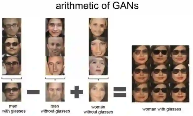这种算法在隐空间上同样适用:「一个戴眼镜的男人」减去「男人」加上「女人」就等于「一个戴眼镜的女人」。
