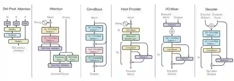 为了达到这个目的,他们使用多种不同的模块构建了一个复杂的网络架构以处理不同的输入数据并生成结果。编码器/解码器模块包含三种类型:卷积、注意和 MoE(https://arxiv.org/abs/1701.06538)。