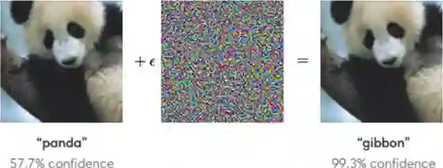 对抗性样本这一领域也有非常大的活力,研究者希望找到这种令模型不稳定的因素而提升识别性能。例如在 ImageNet 中,训练的模型在识别加了一些噪点的样本会完全识别错误,这样加了噪点的图像可能在我们人眼看来是没有问题的。这一问题展现在下图中,熊猫的图像加了一点噪声就会被错误识别为长臂猿。