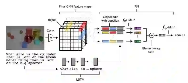 使用 RN 的网络可以处理桌子上的各种形状(球体、立方体等)物体组成的场景。为了理解这些物体之间的关系(如球体的体积大于立方体),神经网络必须从图像中解析非结构化的像素流,找出哪些数据代表物体。在训练时,没有人明确告诉网络哪些是真正的物体,它必须自己试图理解,并将这些物体识别为不同类别(如球体和立方体),随后通过 RN 模块对它们进行比较并建立「关系」(如球体大于立方体)。这些关系不是硬编码的,而是必须由 RN 学习——这一模块会比较所有可能性。最后,系统将所有这些关系相加,以产生场景中对所有形状对的输出。