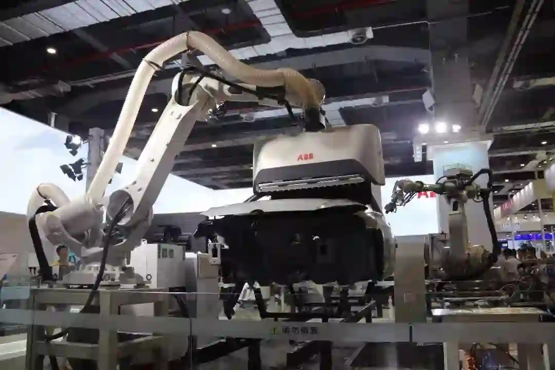 YuMi单臂机器人和双臂机器人、YuMi和IRB 1100机器人组成的柔性生产线、气势浩大的汽车车身除尘(小编一到展台就被吸引过去了+引无数人拍照,你说气势浩不浩大)、白车身标准部件解决方案、物流配送机器人解决方案、物品分拣、3D视觉技术质量检测和电动汽车电池制造。